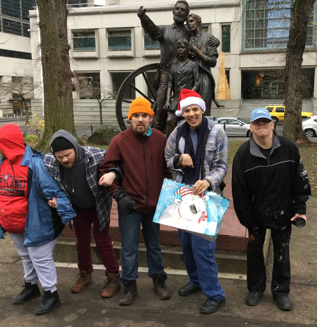 Richardo S., Jerry J., Erik G., Chasse H. and Donald B. are all part of Dungarvin Oregon’s Supported Employment Program. They work doing maintenance for Dungarvin programs and our Portland Office. On a chilly day in December, the Maintenance Crew paid forward to the community by passing out new socks to those in need in downtown Portland. The Crew’s compassionate actions were prompted by the Crew’s long time leader and supervisor, James Salisbury.