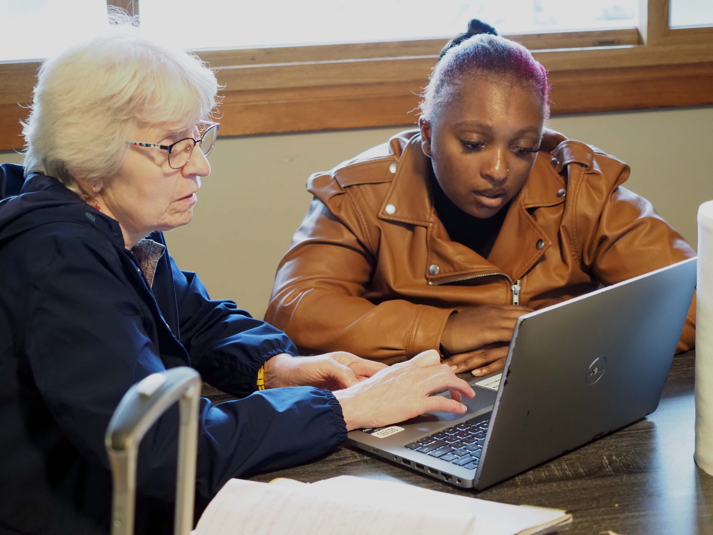 Akila works with Ruth Phelps, Dungarvin Vocational Rehab Coordinator, to fill out a job application.